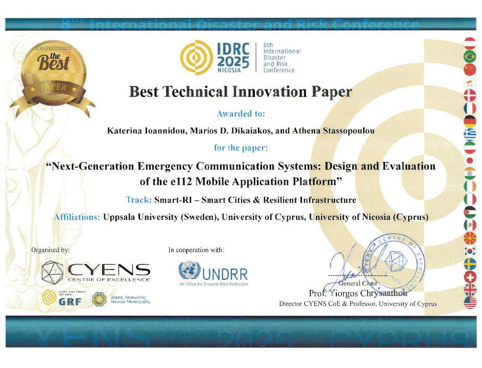 Katerina loannidou, Marios D. Dikaiakos, and Athena Stassopoulou, for ‘Next-Generation Emergency Communication Systems: Design and Evaluation of the e112 Mobile Application Platform’.