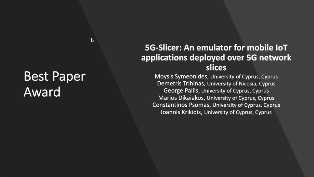 Moysis Symeonidis, Demetris Trihinas, George Pallis, Marios D. Dikaiakos, Constantinos Psomas, and Ioannis Krikidis, for ‘5G - Slicer:An emulator for mobile IoT applications deployed over 5G network slices’.