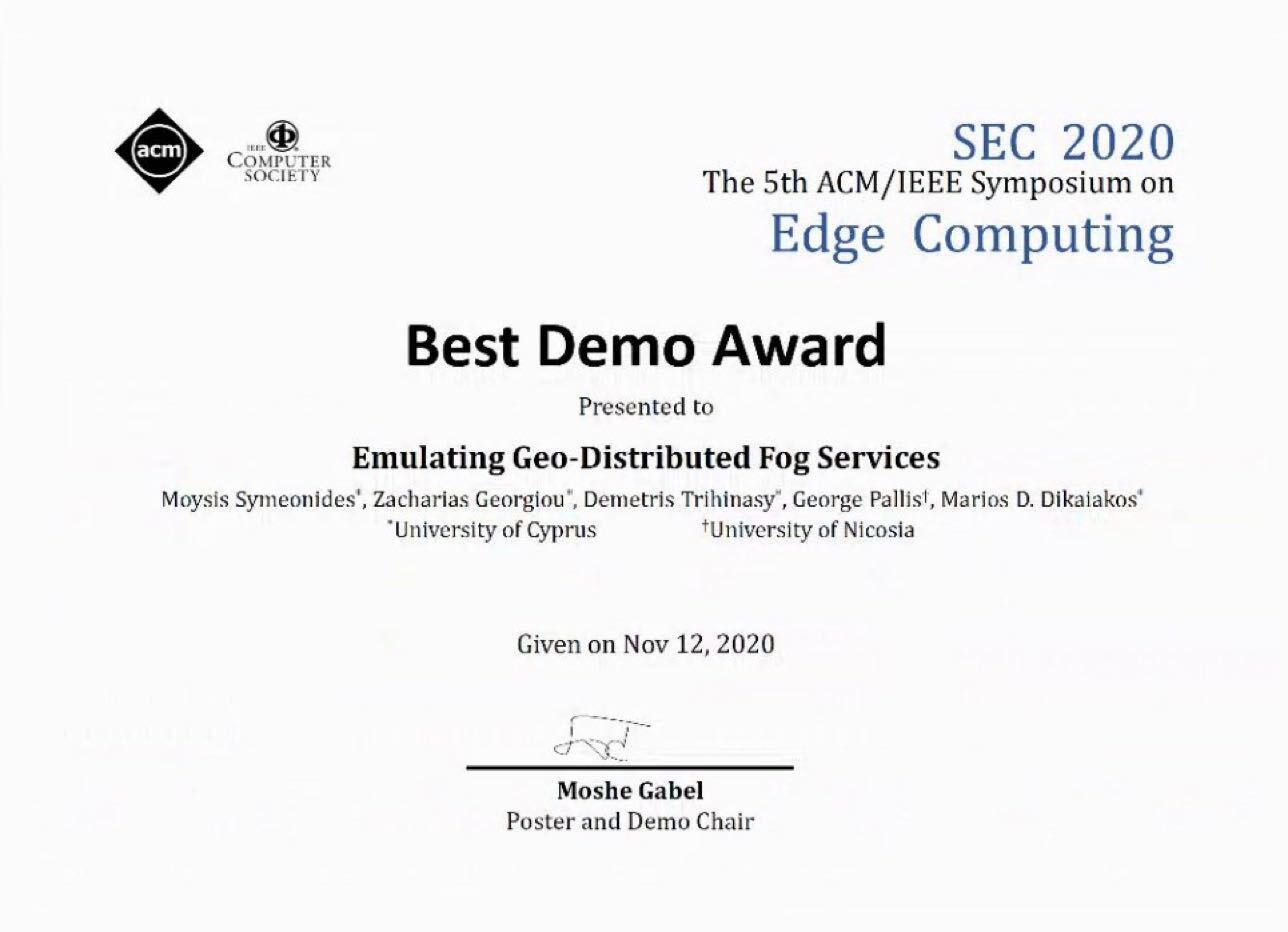 Moysis Symeonidis, Zacharias Georgiou, Demetris Trihinas, Marios D. Dikaiakos, George Pallis for ‘Fogify: A Fog Computing Emulation Framework’.